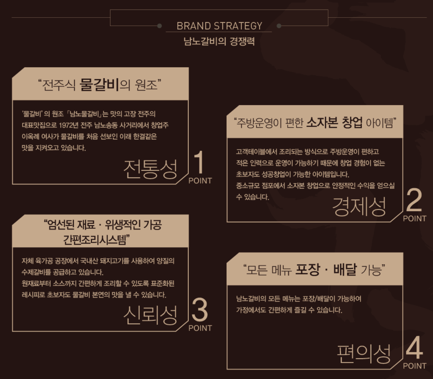 남노갈비’는 테이블에서 조리되는 방식으로 주방운영이 편하기 때문에 소자본 창업아이템으로 아주 적합합니다. 주원료인 육류는 직영 육가공 공장에서 국내산 돼지고기를 사용한 수제갈비를 공급하고 있으며, 표준화된 레시피로 초보자도 물갈비 본연의 맛을 낼 수 있는 것이 장점입니다.